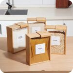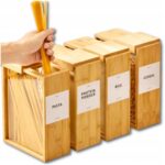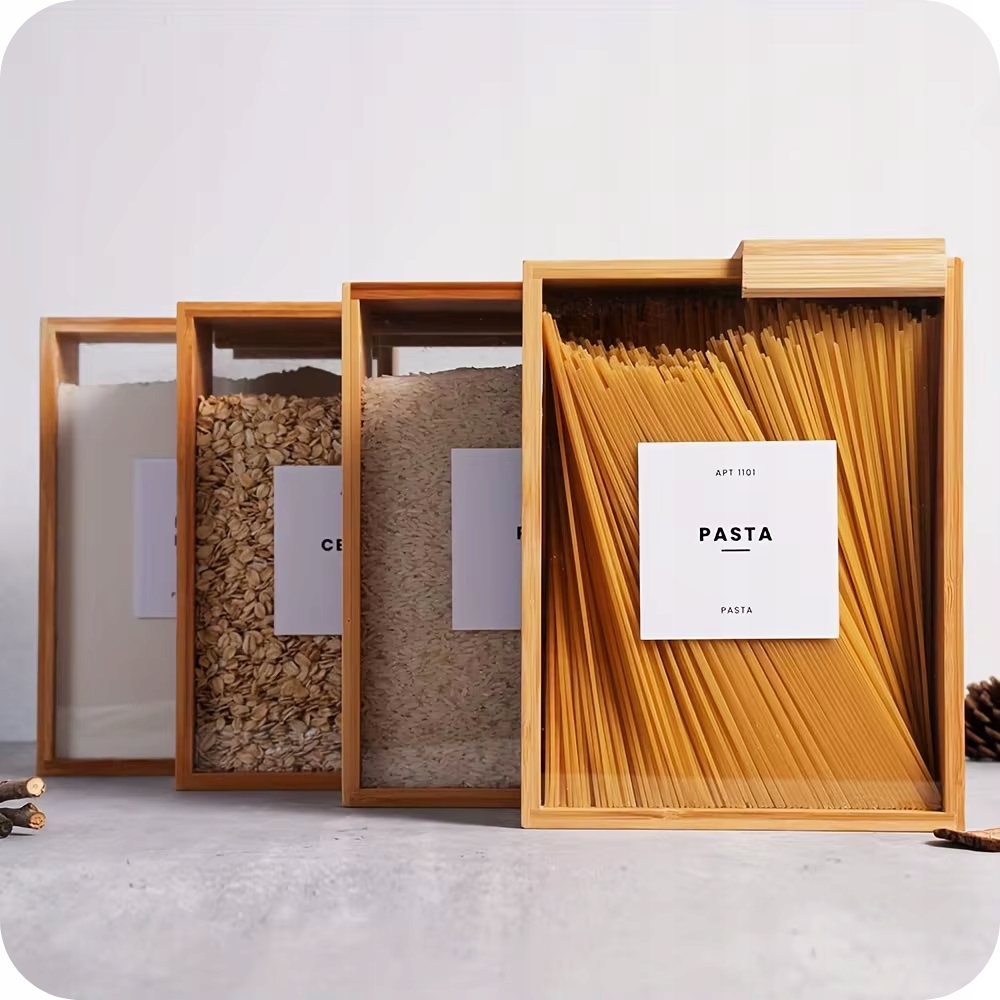 Zestaw 4 bambusowych pojemników modułowych to eleganckie i ekologiczne rozwiązanie do organizacji Twojej kuchni. Wykonane z trwałego bambusa, posiadają przejrzysty front dla łatwej identyfikacji zawartości (makaron, ryż, kawa) oraz łatwy system otwierania klapką, gwarantując estetyczny porządek i higieniczne przechowywanie produktów sypkich.