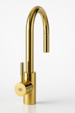 Złota bateria umywalkowa o nowoczesnym, geometrycznym kształcie i minimalistycznej dźwigni idealnie wpisuje się w najnowsze trendy wnętrzarskie.