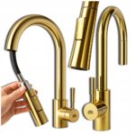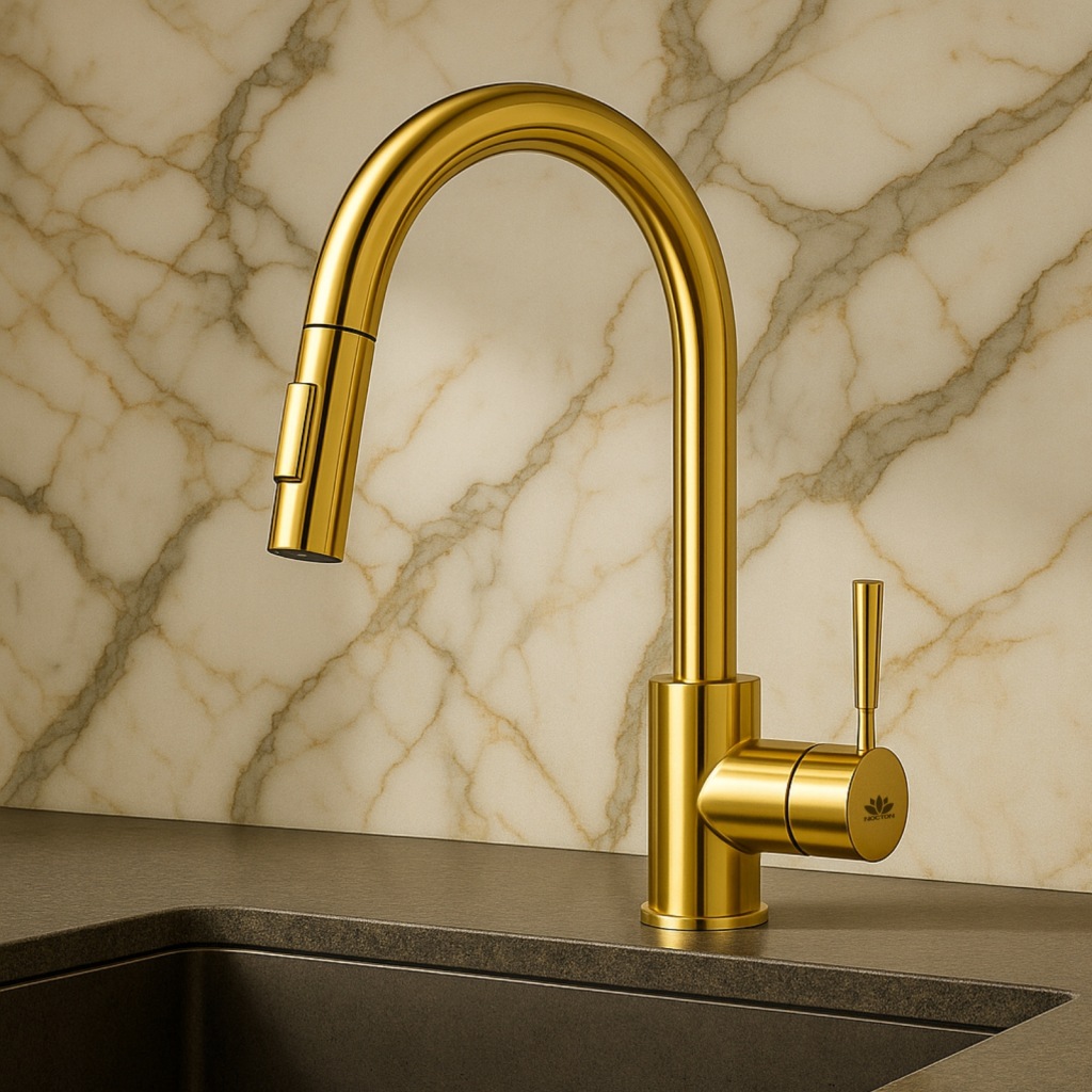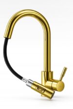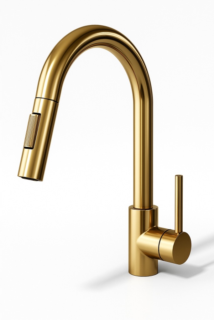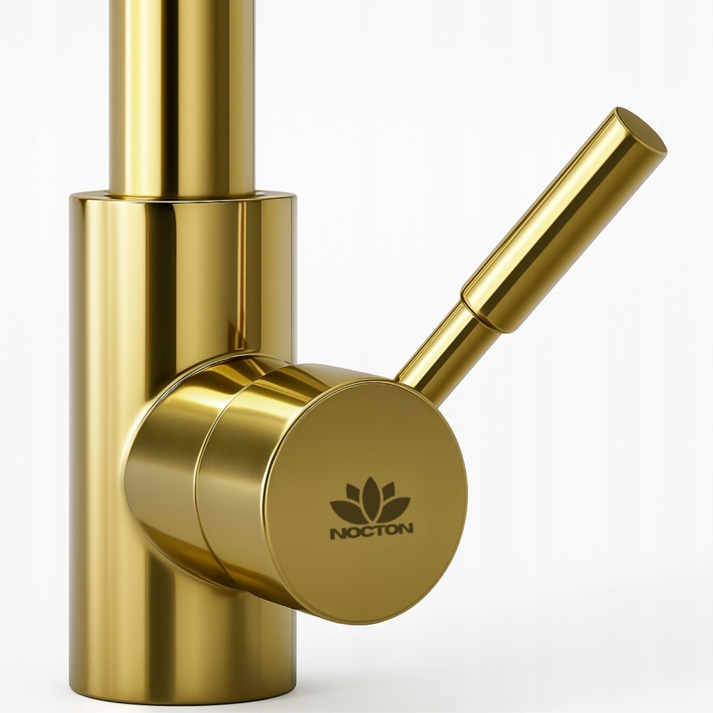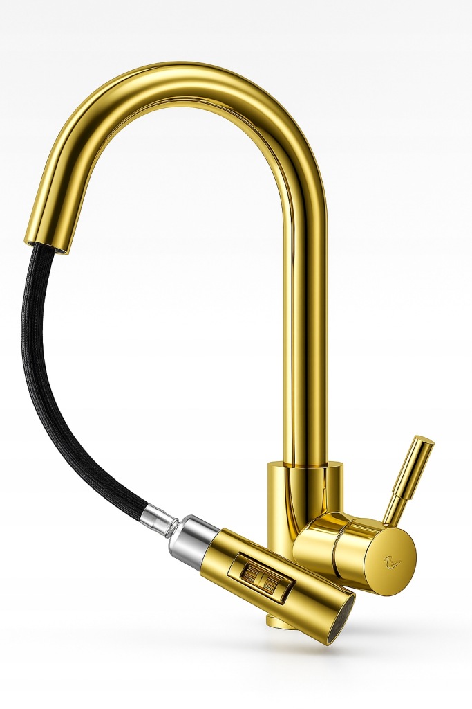 Ta nowoczesna bateria umywalkowa w kolorze złotym zapewnia pełną wszechstronność dzięki innowacyjnej, wyciąganej wylewce z elastycznym wężem i trybem prysznicowym. Oferuje maksymalną ergonomię i regulację dzięki obrotowej głowicy 360°. Wykonana z trwałych materiałów, łączy ponadczasowy, minimalistyczny design z prostym montażem i komfortową regulacją temperatury, idealnie ułatwiając codzienne czynności i czyszczenie umywalki.