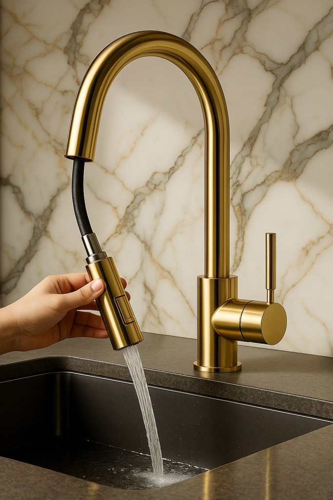 ✅ Pełna wszechstronność (wyciągana wylewka + tryb prysznicowy) – Wyciągany element z elastycznym wężem i przyciskiem do zmiany strumienia zapewnia maksymalną wygodę przy myciu twarzy, głowy czy czyszczeniu umywalki.