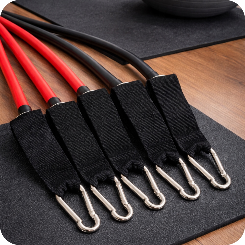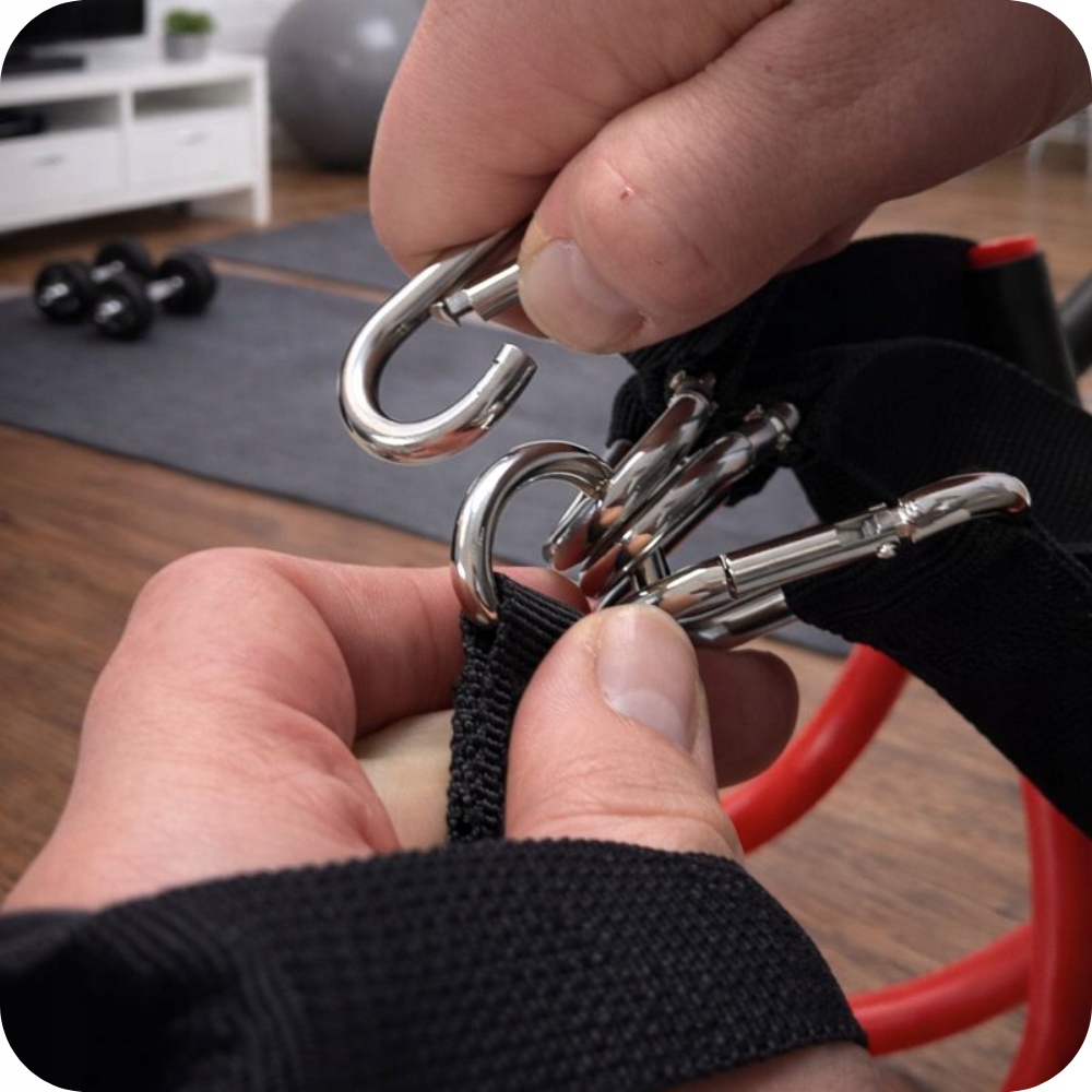 Zastosowane metalowe karabińczyki pozwalają na błyskawiczne zakładanie i zdejmowanie gum oraz ich dowolne łączenie. Dzięki temu w kilka sekund zmienisz poziom oporu bez przerywania treningu. To ogromna wygoda, szczególnie podczas treningów obwodowych lub interwałowych. Solidne karabińczyki gwarantują stabilność połączeń i bezpieczeństwo, nawet przy maksymalnym obciążeniu.