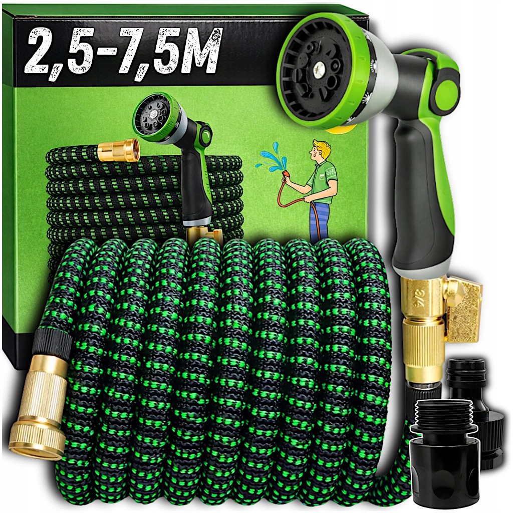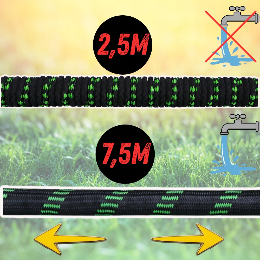 ✅ Automatycznie rozciąga się i kurczy — wąż ma długość roboczą od 2,5 m do 7,5 m, ale pod wpływem ciśnienia wody wydłuża się do pełnej długości, a po zakręceniu wraca do kompaktowego rozmiaru.
