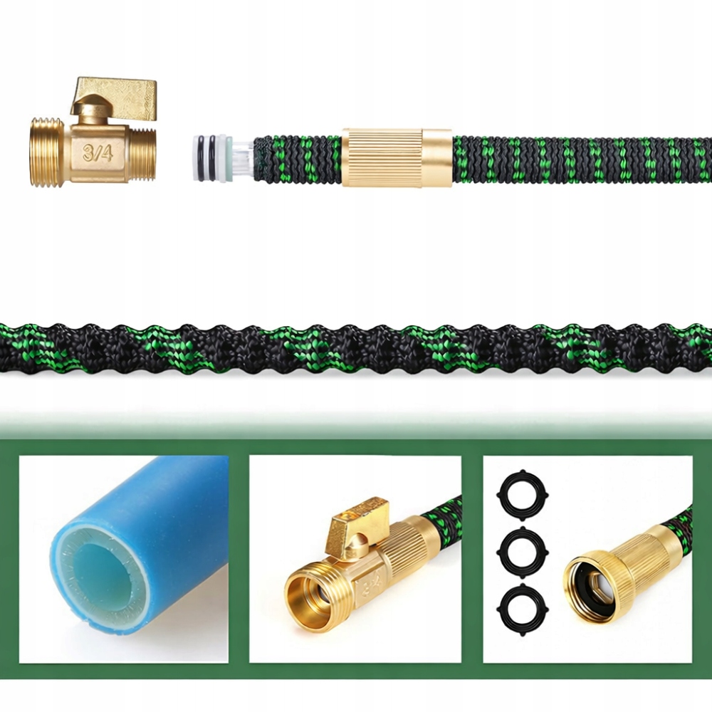 Wąż sprzedawany jest w zestawie z adapterami i szybkozłączką, dzięki czemu pasuje do większości standardowych kranów ogrodowych (3/4″ oraz 1/2″). Dodatkowe uszczelki zwiększają szczelność połączeń i poprawiają trwałość użytkowania. Produkt nie wymaga dokupowania dodatkowych elementów – możesz korzystać z niego od razu po podłączeniu.